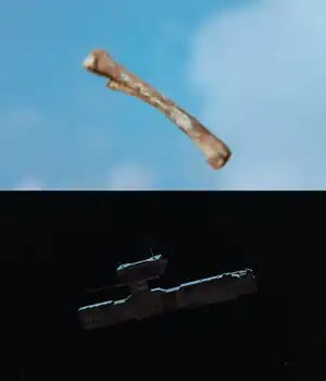 In a prehistoric veld, a tribe of hominins is driven away from a water hole by a rival tribe, and the next day finds an alien monolith. The tribe learns how to use the bones of dead animals as weapons and, after a successful first hunt, uses them to drive away the rival tribe.