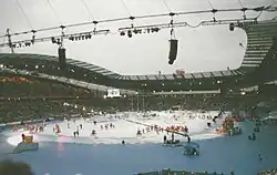 The Games' main venue was the City of Manchester Stadium (now Etihad Stadium), which hosted all athletics events, the rugby sevens and the opening and closing ceremonies. The stadium was a smaller and downscaled version of that proposed during Manchester's bid for the 2000 Summer Olympics. Construction started in January 2000,[17] and was completed shortly before the Games. The cost was approximately £110 million, £77 million of which was provided by Sport England, with the remainder funded by Manchester City Council.[18] For the Commonwealth Games the stadium featured a single lower tier running around three sides of the athletics track, and second tiers to the two sides, with an open-air temporary stand at one end, giving an overall capacity of 41,000.[19] The stadium formed the centrepiece of an area known as Sportcity. Other venues in Sportcity include the Manchester Velodrome, which hosted cycling, and the £3.5 million National Squash Centre, which was built specifically for the Games.[20]