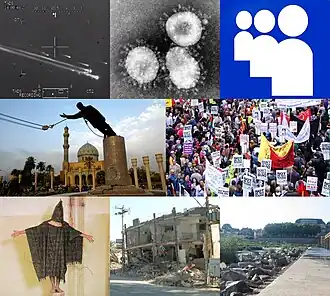 From top left, clockwise: the crew of STS-107 perish when the Space Shuttle Columbia disintegrates during reentry into Earth's atmosphere; The 2002–2004 SARS outbreak in China becomes an epidemic; Myspace becomes one of the first major social media platforms; Protests against the Iraq War in London; a drained river in France during the European heatwave; an earthquake in Bam, Iran, kills 30,000 people; The abuse and torture of Iraqi prisoners at Abu Ghraib prison by U.S. personnel; a statue of Saddam Hussein is toppled in Baghdad after his regime is deposed