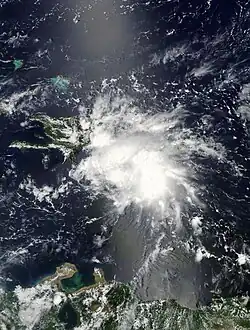 A strong tropical wave moved off the coast of Africa on August 14,[61] and after tracking steadily westward an area of convection began to become better organized on August 18.[62] After it tracked through the Lesser Antilles, it developed into Tropical Depression Nine on August 21 to the south of Puerto Rico. The depression quickly showed signs of organization, and forecasters predicted the depression to intensify to a strong tropical storm.[63] However, strong southwesterly wind shear unexpectedly became established over the system, and the depression degenerated into a tropical wave late on August 22 to the south of the eastern tip of the Dominican Republic.[61]
