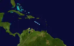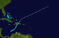 The depression initially maintained good outflow and some banding features around its center and was forecast to become a tropical storm.[30] Around 09:00 UTC on June 11, satellite-based intensity estimates indicated the depression was near tropical storm status.[34] However, the convection subsequently diminished and became displaced to the northeast of the center, and late on June 11 the depression degenerated into an open tropical wave about 950 mi (1,530 km) east-southeast of Barbados.[27] A low-level vorticity persisted, though strong wind shear prevented redevelopment.[35] On June 13 its remnants passed through the Windward Islands and subsequently entered the Caribbean.[36]