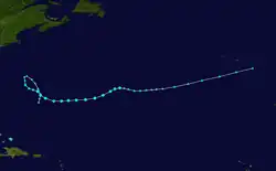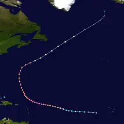 On August 25, a tropical wave exited the west coast of Africa, and two days later developed enough organized convection to become Tropical Depression Ten approximately 420 mi (675 km) west of the Cabo Verde Islands. Tracking through warm waters and low vertical shear, the depression was named Tropical Storm Fabian on August 28. On August 30, the storm intensified into a hurricane, and it quickly strengthened to attain major hurricane status late that day. Fabian reached maximum sustained winds of 145 mph (230 km/h) on September 1, a Category 4 hurricane. The hurricane turned to the north and gradually weakened, although its barometric pressure fell to 939 mbar (27.7 inHg) early on September 4. Fabian then passed about 15 mi (25 km) west of Bermuda late on the next day with winds of 120 mph (190 km/h). The cyclone accelerated northeastward into an environment of unfavorable conditions, becoming extratropical on September 8 roughly 805 mi (1,295 km) east-northeast of Cape Race, Newfoundland. Two days later, the remnants of Fabian merged with another extratropical storm between southern Greenland and Iceland.[23]
