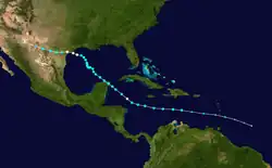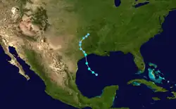 A well-organized tropical wave tracked quickly through the Lesser Antilles on July 7, producing tropical storm force winds but failing to attain a low-level circulation. After organizing in the Caribbean, it developed into Tropical Storm Claudette to the south of the Dominican Republic on July 8. Its intensity fluctuated over the subsequent days, attaining hurricane status briefly on July 10 before weakening and hitting Puerto Morelos on the Yucatán Peninsula on July 11 as a tropical storm. The storm remained disorganized due to moderate wind shear, though after turning west-northwestward into an area of lighter shear, it re-attained hurricane status on July 15 off the coast of Texas; it intensified quickly and made landfall on Matagorda Island with peak winds of 90 mph (140 km/h). It slowly weakened after moving ashore, tracking across northern Tamaulipas before dissipating in northwestern Chihuahua.[17]