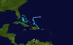 The depression dropped 2 to 3 in (51 to 76 mm) of precipitation on Puerto Rico,[64] leading to floodwaters that entered 10 houses and prohibited passage of some streets.[65] Additionally, a mudslide occurred at Caguas,[66] while a river overflowed in Río Grande but returned to normal levels within hours.[67] Damage in Puerto Rico totaled $20,000.[65] The remnants of the depression dropped light to moderate precipitation in the Dominican Republic, which caused flooding and overflowing rivers that damaged more than 100 homes and some crops.[16] However, the rainfall was otherwise beneficial due to dry conditions in the preceding months.[68] Flooding was also reported in eastern Jamaica.[16]