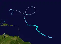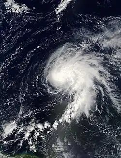A tropical wave moved westward off the coast of Africa on July 14.[44] After tracking steadily westward, an area of thunderstorms became more concentrated as its upper-level environment became more favorable,[45] and late on July 19 the National Hurricane Center classified it as Tropical Depression Six while it was located about 1,035 mi (1,665 km) east of the Lesser Antilles.[44] Upon being classified as a tropical cyclone, the depression maintained two ill-defined hooking bands to its north and south, and was originally forecast to attain hurricane status before passing through the Lesser Antilles. With warm waters and very light wind shear forecast, its environmental conditions met four out of five parameters for rapid intensification.[46] Subsequently, convection diminished as the result of cold air inflow and instability from a disturbance to its southeast.[47]