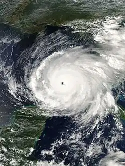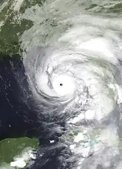 With 28 storms (27 named storms and one unnamed), the 2005 Atlantic hurricane season set a new single-year record for most storms, surpassing the total of 20 from 1933.[15] This record stood until surpassed by the 2020 season, which had 30 storms.[16] A total of 7 named storms formed before August 1, which exceeded the record of 5 set in 1997; this record stood until 2020. The fourth named storm developed at a then-record early date, surpassed in 2012. The fifth though eleventh and the thirteenth and onward named storms developed at then-record early dates that were later surpassed in 2020.[17] Further, the months of July and November set records for number of named storms, with 5 and 3, respectively. The 2005 season featured 15 hurricanes, surpassing the previous record of 12, set in 1969. Of the 15 hurricanes, 5 formed in September, with the season becoming only the sixth to feature 5 in that month.[17] The 2005 season also featured a record seven major hurricanes, one more than the previous record, set in 1926, 1933, 1950, 1996, and 2004. The four Category 5 hurricanes were also a record.[15][18] The season's activity was reflected with an ACE rating of 244, the second-highest value on record in the Atlantic basin, after the 1933 season.[19][20] The season would mark the end of a streak of three consecutive hyperactive seasons, beginning in 2003.