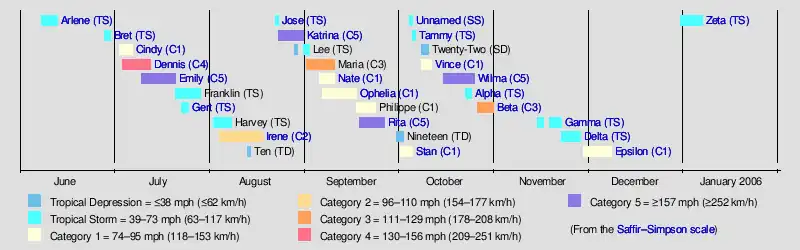 The 2005 Atlantic hurricane season was a record-breaking, devastating and deadly Atlantic hurricane season. It is the second-costliest hurricane season, just behind the 2017 season. It featured 28 tropical and subtropical storms,[1] which was the most recorded in a hurricane season until the 2020 season. The United States National Hurricane Center[nb 1] named 27 storms, exhausting the annual pre-designated list, requiring the use of six Greek letter names, and adding an additional unnamed subtropical storm during a post-season re-analysis. A record 15 storms attained hurricane status, with maximum sustained winds of at least 74 miles per hour (119 km/h). Of those, a record seven became major hurricanes, rated Category 3 or higher on the Saffir–Simpson scale. Four storms of this season became Category 5 hurricanes, the most of any season on record.