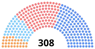 | Total seats: | 36 | 28 | 14 | 14 | 106 | 75 | 10 | 11 | 4 | 7 | 1 | 1 | 1 | 308 | ||