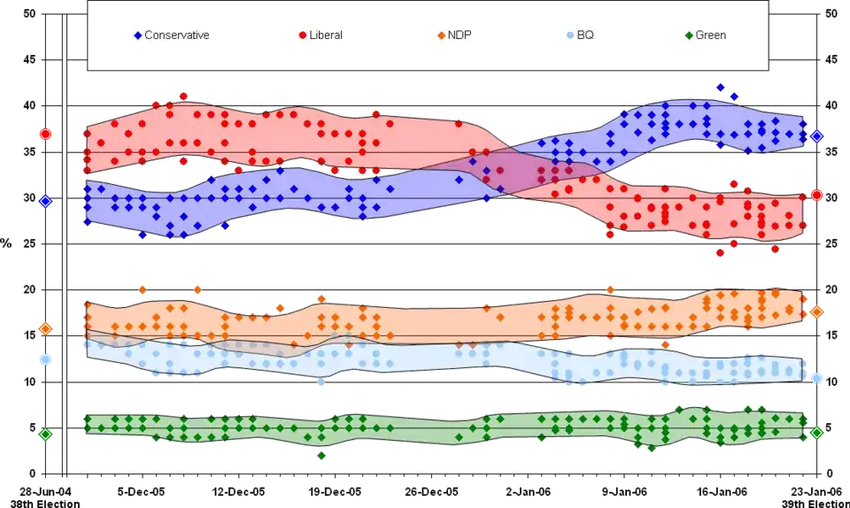 Stephen Harper's Conservatives succeeded in bringing their new party into power in Canada. While continuing weaknesses in Quebec and urban areas rightfully prompted most observers to consider a Conservative majority government to be mathematically difficult to achieve, early on, Harper's stated goal was to achieve one nonetheless. Though the Conservatives were ahead of the Liberals in Quebec, they remained far behind the Bloc Québécois, and additional gains in rural and suburban Ontario would have been necessary to meet Stephen Harper's goal. The polls had remained pretty well static over the course of December, with the real shift coming in the first few days of the New Year. That is when the Conservatives took the lead and kept it for the rest of the campaign.