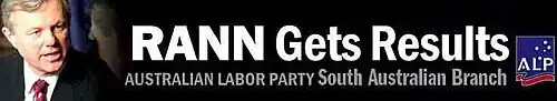 The Labor campaign was heavily based around Premier Mike Rann with Labor's advertising swapping between the mottos "Building South Australia" and, to a greater extent, "RANN Gets Results".[41] Some commentators also argued that the "presidential" style of campaign, common in modern Australian politics, could be seen in Labor's formal campaign launch at the Norwood Town Hall the Sunday before the election, which had some similarities to the nomination conventions that the major parties hold in the United States.[42]