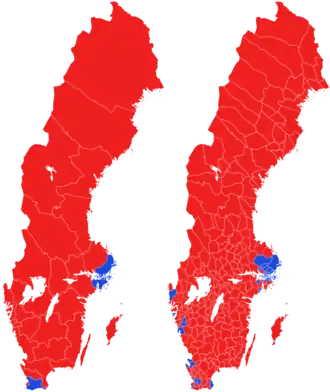 Reinfeldt reached out to working-class votes in the re-branding as the 'New Moderates', which resulted in sizeable gains in historically left-wing locations in densely populated areas. As a result, several municipalities that had never voted blue before in Stockholm County flipped.[1] This, combined with a landslide overall win in the capital region as a whole and strong showings in Scania tipped the balance in favour of the Alliance. The centre-right bloc also flipped the crucial populous municipalities Gothenburg, Linköping, Uppsala and Västerås.[1]