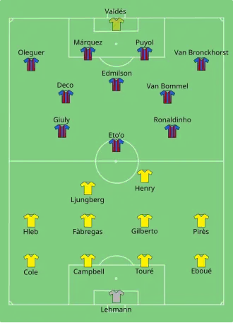 Ultimately, Barcelona fielded a 4–3–3 formation with Mark van Bommel and Edmílson lining up in midfield alongside Deco, ahead of Xavi and Andrés Iniesta. Lionel Messi did not feature in the matchday squad, despite returning from injury and featuring in the 22-man squad, while Henrik Larsson was among the substitutes in potentially his last game for the club. Arsenal fielded a 4–4–1–1 formation, which saw Emmanuel Eboué replace the injured Lauren, and Ashley Cole return at left-back to make only his third appearance in the competition that season due to injury. Thierry Henry was deployed as the lone striker, with Freddie Ljungberg playing off his shoulder.[16][17]