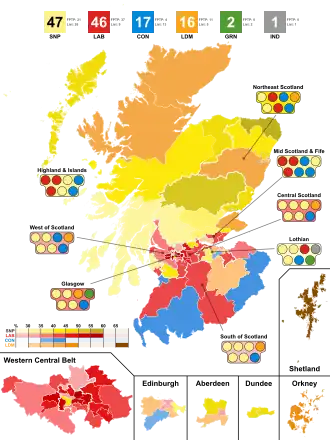 The Scottish National Party emerged as the largest party with 47 seats, closely followed by the incumbent Scottish Labour Party with 46 seats. The Scottish Conservatives won 17 seats, the Scottish Liberal Democrats 16 seats, the Scottish Greens two seats and one Independent (Margo MacDonald) was also elected. The SNP initially approached the Liberal Democrats for a coalition government, but the Lib Dems turned them down.[2] Ultimately, the Greens agreed to provide the numbers to vote in an SNP minority government, with SNP leader Alex Salmond as First Minister.[3]