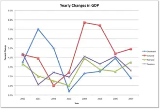 Economic growth in Iceland, Denmark, Norway and Sweden from 2000 to 2007. Iceland is in red.
