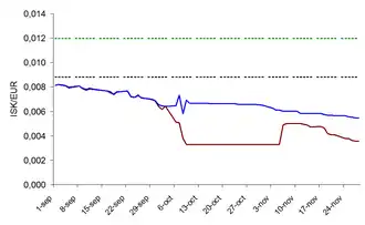 During November, the real exchange rate (discounting inflation) of the Icelandic króna, as quoted by the Central Bank of Iceland, was roughly one-third lower than the average rate from 1980 to 2008, and 20% lower than the historical lows during the same period.[22] The external rate as quoted by the European Central Bank was lower still.[17] On the last trading day of the month, 28 November, the Central Bank of Iceland was quoting 182.5 krónur to the euro,[11] while the European Central Bank was quoting 280 krónur to the euro.[17]