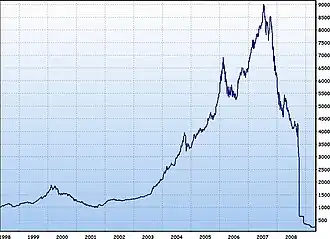 The value of the OMX Iceland 15 from January 1998 to October 2008