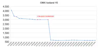 Trading in shares of six financial companies on the OMX Nordic Iceland Exchange was suspended on 6 October by order of the FME.[83] On Thursday 9 October, all trading on the exchange was frozen for two days by the government "in an attempt to prevent further panic spreading throughout the country's financial markets". The decision was made to do so due to "unusual market conditions",[84] with share prices having fallen 30% since the start of the month.[85] The closure was extended through Monday 13 October due to continuing "unusual market conditions".[86]