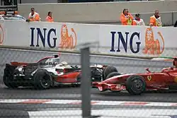 Hamilton clinched his fifth pole position of the season with a time of 1:47.338, ahead of Felipe Massa, who qualified second 0.34 seconds behind his McLaren rival.[16] A mistake-free run allowed Kovalainen to take third place on the grid, alongside Räikkönen in fourth.[15] Heidfeld took fifth, ahead of Alonso, Webber and Kubica. Bourdais – after setting the quickest time in the first session – took ninth, one place ahead of his Toro Rosso teammate Vettel.[17] Toyota driver Jarno Trulli qualified 11th after he experienced problems generating heat into his tyres; his teammate Timo Glock experienced similar problems and lined up from 13th behind Piquet. Coulthard and Rosberg took the next two grid spots, ahead of the Honda pair of Rubens Barrichello and Jenson Button, who both believed they had maximised the performance of their cars.[15] Force India driver Adrian Sutil, Williams driver Kazuki Nakajima and Fisichella took the final three positions.[16]