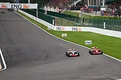 The 2008 Belgian Grand Prix (officially the 2008 Formula 1 ING Belgian Grand Prix)[5] was a Formula One motor race held on 7 September 2008 at the Circuit de Spa-Francorchamps near the village of Francorchamps, Wallonia, Belgium. It was the 13th race of the 2008 Formula One World Championship. Felipe Massa for the Ferrari team won the 44-lap race, after the initial winner, McLaren driver Lewis Hamilton, was penalised for cutting a chicane and gaining an advantage over Ferrari's Kimi Räikkönen.