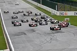 Nelson Piquet was the only driver not to start with the softer compound dry-weather tyres on a track which was still drying from morning rain, with the Brazilian opting for the harder tyre available.[19] There was a strong chance of showers predicted during the race.[20] Several cars were slow away on the slippery track, most notably Kovalainen. The main beneficiaries off the line were Piquet and Trulli, who each gained five places. Trulli was hit from behind at the first corner by Bourdais, who also had a quick start. The Toyota suffered diffuser and gearbox damage from the incident, spinning later in the lap.[21] Kovalainen and Heidfeld also collided at the start. This allowed Alonso to gain several places. Sebastian Vettel locked his brakes and ran wide, losing two places. Fisichella collided with Nakajima on the first lap and had to pit to fix a broken front wing and punctures.[22] Hamilton led from Räikkönen who managed to pass his Ferrari teammate Felipe Massa on the Kemmel straight.[23]