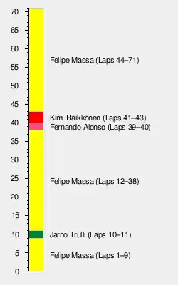 Timo Glock was fuelled so he could complete the race without stopping again at his pit stop on lap 36.[26] Massa was the first of the championship frontrunners to pit, on lap 38; Alonso and Hamilton made pit stops two laps after. When Räikkönen made a pit stop on lap 43, Massa had regained the lead, ahead of Alonso. Räikkönen rejoined ahead of Hamilton in third place.[33][35] Fisichella's stop was marred by transmission problems, dropping him to 18th position when he resumed.[26][38] Vettel made a pit stop again on lap 51, his team fuelling him to the finish. He rejoined in fifth.[26] By lap 54, Massa had extended his already comfortable lead over Alonso to 9.6 seconds. Vettel was closing in quickly on Hamilton, the McLaren driver needing to finish no lower than fifth to win the championship.[26]