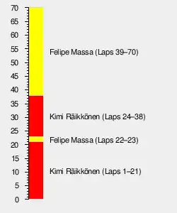 On lap 20, Trulli and Kubica, then in fourth, pitted.[35] Over the next two laps, both Räikkönen and Massa pitted.[35] By lap 30, Räikkönen had opened his lead to 6.6 seconds over Massa, while Trulli was over half a minute behind him in third.[35] Just before half distance, Räikkönen's pace became slower, and Massa behind him caught up, passing his teammate on lap 39.[35] After the race, Räikkönen explained that his lack of pace was due to his car's right exhaust pipe breaking, causing the engine to lose power.[36] Further back, Kovalainen, who was running seventh, passed Webber to take sixth.[35]
