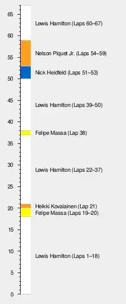 Piquet, on a one-stop strategy after his poor qualifying performance, had fortuitously pitted immediately prior to the safety car's deployment and was also fuelled to the end of the race.[21][22] Promoted to third place from 14th beforehand following the pit stops, he was set to take the lead once Hamilton and Heidfeld (who also had not pitted under the safety car conditions) pitted for their final stops.[24] Further back, Vettel squeezed past Alonso at the pit exit, pushing him over the white line separating the pit lane exit from the track. Alonso complained over his radio but no action was taken against either driver.[22] Meanwhile, Räikkönen dropped several places to 11th, having had to queue behind Massa at the second pit stops.[22]