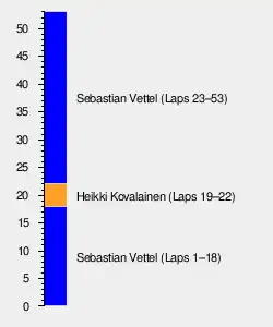 Hamilton began lapping fastest, recording a 1:32.869 on lap 38, more than a second faster than first-placed Vettel.[27] Lap 45 saw three drivers set consecutive new fastest laps; Kubica's 1:32.366 was beaten by Webber with a 1:32.014s. They were then superseded by Räikkönen, who set a 1:31.691.[27] On lap 49 Webber attempted to pass Hamilton at the first chicane, but the two cars touched wheels.[22] Webber was forced down the escape road, and when he emerged in front of Hamilton, he returned the position.[27] Räikkönen continued to move through the field; he passed Coulthard and Piquet in separate manoeuvres to take ninth position.[27] Nakajima attempted to pass Coulthard into turn nine, but succeeded only in turning into the Red Bull RB4, sending it into the gravel trap.[32][33] Coulthard pitted for a new front wing, which dropped him to 17th.[27] Vettel crossed the finish line on lap 53 by 12.5 seconds over Kovalainen, becoming the youngest driver in Formula One history to win a Grand Prix.[34][35] The one-stop strategies used by Kubica and Alonso paid off as they finished in third and fourth, respectively.[34] Heidfeld, Massa, Hamilton and Webber rounded out the top eight.[34] Räikkönen finished in ninth position, setting the fastest laptime of 1:28.047 on the final lap.[34]