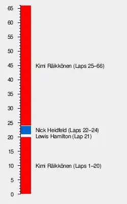 Räikkönen, Massa, Hamilton, Kubica and Alonso, having already made their pit stops, trailed the safety car until it peeled off on lap 29.[31] As Räikkönen again increased his lead over Massa to more than two seconds, Alonso pulled over to the side of the track, smoke billowing from his engine, and retired.[27] Rosberg's engine also suffered a failure, and the Williams retired on lap 42 from seventh place.[31] Four laps later, Räikkönen set the fastest lap of the race, a 1:21.670, as Massa pitted from behind him.[29] Räikkönen, Hamilton and Kubica followed into the pit-lane on lap 47.[35] Coulthard and Glock collided on lap 53 after the Toyota driver attempted to pass the Red Bull at the first corner.[27] Glock sustained front wing damage, and Coulthard suffered a puncture to his left rear tyre; both pitted soon after for repairs.[35]