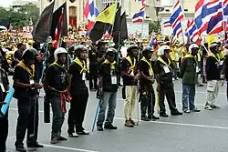 On the morning of 28 November, PAD leader Chamlong Srimuang announced to PAD forces that he had received a call from an unspecified "senior person" (ผู้ใหญ่ท่านหนึ่ง) telling him to end the rallies. But he refused to do what the senior person told him. "For the past 108 days, the Alliance has protested together under hardship, while another group of people has remained in comfort. They can't just suddenly ask us to stop protesting," he told the assembled forces.[69] Addressing supporters on ASTV, Sondhi said, "If we have to die today, I am willing to die. This is a fight for dignity."[70]