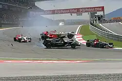 At the start, Hamilton immediately overtook Kovalainen to claim second behind Massa.[34] Räikkönen had a bad start and was squeezed into the first corner by Kovalainen.[35] The two cars made light contact, with Räikkönen's front wing touching Kovalainen's left rear tyre. This resulted in a puncture for the McLaren driver which forced him to make an unscheduled pit stop on the second lap, which dropped him to 18th and last position.[35][36] Räikkönen damaged his front wing but continued the entire race distance without changing the nose section of his car. Meanwhile, Kubica took advantage to move up into third position, whilst Räikkönen was also passed by Alonso.[36] Further back, Vettel collided with Sutil and both were forced to pit, Vettel with a puncture and Sutil for a new front wing.[37][38] Sutil's teammate Fisichella and Nakajima collided at the first turn as well,[36] after Fisichella braked too late and could not avoid the Williams driver.[39] Fisichella retired on the spot but Nakajima, despite losing both his front and rear wing in the incident, was able to make it back to his pit box before retiring.[36] The incident resulted in the safety car being deployed.[36]