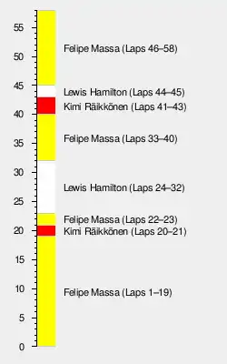 The safety car was withdrawn at the end of the second lap and the race got underway again with Massa in the lead.[36] Räikkönen, meanwhile, overtook Alonso for fourth place.[36] Between lap four and lap eleven, Massa and Hamilton exchanged fastest laps and the McLaren driver managed to hold the gap between him and the leader at one and a half seconds.[36] The two drivers left third-placed Kubica behind, who in turn was being caught quickly by Räikkönen.[36] Further back, Kovalainen passed Sutil on lap 12 and Vettel on lap 17.[36] Hamilton then began to close the gap between himself and Massa, posting consecutive quick lap times and was within seven–tenths of a second by lap fifteen.[36] Alonso was the first of the leading runners to make a pit stop on lap 15, dropping to tenth.[35] Hamilton pitted one lap later and dropped to sixth, while Massa stayed out for another three laps.[36] Both he and Kubica pitted at the same time, leaving Räikkönen temporarily in the lead. On lap 20, he set the fastest lap of the race, a 1:21.506, before he himself pitted at the end of lap 21, as did the then second-placed Heidfeld.[2][36] Räikkönen rejoined ahead of Kubica, while Heidfeld came out ahead of both Alonso and Webber, to elevate himself to fifth.[35][36] Massa was now back in the lead, but with Hamilton just 0.8 seconds behind.[36] Running lighter on fuel with a view to making an additional pit stop to the Ferrari driver, Hamilton was able to close the gap on Massa and on lap 24, he overtook him at turn twelve.[36] Hamilton now led, with Massa second and Räikkönen third.[36]