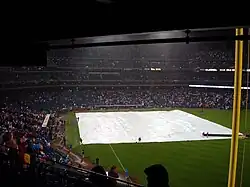Games 3 and 5 of the World Series were delayed by rain storms in Philadelphia, with the start of Game 3 on Saturday, October 25 being delayed an hour and 31 minutes (with that game ending at 1:47 am EDT on Sunday, October 26). Game 5, which began on Monday, October 27, was suspended after the top of the 6th inning and resumed Wednesday, October 29.[43] Wet weather which affected Game 5 continued into Tuesday in the Philadelphia area, as Major League Baseball officials studied radar data to determine when Game 5 of the World Series would continue under conditions deemed "appropriate."[43] Up to this point, there had never been a rain-shortened game in Series history, and this was the first suspension.[43] As a result, had it been necessary to play them, Games 6 and 7 in St. Petersburg, originally scheduled for October 29 and 30, were postponed until a later date.[43]