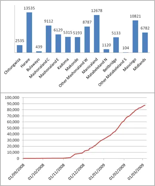 The 2008 Zimbabwean cholera outbreak was an epidemic of cholera affecting much of Zimbabwe from August 2008 until June 2009. The outbreak began in Chitungwiza in Harare Metropolitan Province in August 2008, then spread throughout the country so that by December 2008, cases were being reported in all 10 provinces.[6] In December 2008, The Zimbabwean government declared the outbreak a national emergency and requested international aid.[7] The outbreak peaked in January 2009 with 8,500 cases reported per week.[8] Cholera cases from this outbreak were also reported in neighboring countries South Africa, Malawi, Botswana, Mozambique, and Zambia.[8] With the help of international agencies, the outbreak was controlled, and by July 2009, after no cases had been reported for several weeks, the Zimbabwe Ministry of Health and Child Welfare declared the outbreak over.[8] In total, 98,596 cases of cholera and 4,369 deaths were reported, making this the largest outbreak of cholera ever recorded in Zimbabwe.[8] The large scale and severity of the outbreak has been attributed to poor sanitation, limited access to healthcare, and insufficient healthcare infrastructure throughout Zimbabwe.[8][9]