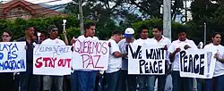Much of the opposition to the de facto Micheletti government and its actions were coordinated through a wide coalition of grassroots organisations and political parties and movements formerly known as Frente Nacional contra el Golpe de Estado en Honduras (FNGE), now Frente Nacional de Resistencia Popular.[167] The FNGE aimed to restore elected President Manuel Zelaya in replacement of the de facto Roberto Micheletti government,[168][169] which is perceived by the participating organisations as a dictatorship, considering the documented human rights violations[170] since the coup d’état and the reappearance of figures involved in disappearances and torture[171] in former coups d’état. The FNGE supports a process of participatory democracy that should lead to a national constituent assembly.[172]