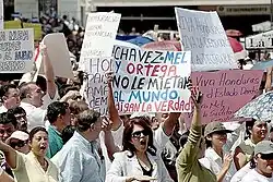 After Zelaya's exile, Chavez alleged that the Venezuelan ambassador was assaulted by Honduran soldiers; Chavez said that if the ambassador were killed or the Venezuelan Embassy were violated, this would constitute an act of war requiring a military response.[153] On 2 July, Honduran police arrested several Cubans and Nicaraguans present at demonstrations, and police sources claimed Venezuelans were active in the anti-coup movement.[154] On 5 July, Venezuelan media showed Hugo Chávez watching Zelaya's attempt to land. Accidentally visible in Chávez's office was the text "051345JUL09 Swarm of africanized bees, Presidential Podium, wounded by stings and desperation of the people", the military-style code for 5, 13 July:45 coincided with a violent confrontation in Honduras.[155][156][157][158] On 8 July, Colombia arrested 80 Venezuelans who attempted to travel to Honduras.[159] On 27 July, police confiscated a booklet in a car owned by Carlos Eduardo Reina, a leader of pro-Zelaya operations. It allegedly contained a list of 15 receipts, dated 24 July, and references to a meeting near Nicaraguan border. The receipts totalled 160,000 US dollars.[160][161] Hugo Chávez allegedly made payments to ambassadors of Honduras.[162][163]