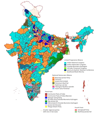 A total of 8,070 candidates contested 543 seats elected in single-member constituencies using first-past-the-post voting.[4] The National Democratic Alliance (NDA), led by the official opposition, the Bharatiya Janata Party (BJP), and the newly formed Third Front, led by Communist Party of India (Marxist) (CPI(M)) and mainly constituted of regional parties, challenged the Congress-led United Progressive Alliance (UPA) government of Prime Minister Manmohan Singh, making the election a triangular fight.[5] Voter turnout over all five phases was around 58%. The results of the election were announced within three days of phase five, on 16 May.[6]