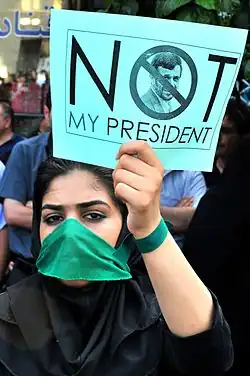 Presidential elections were held in Iran on 12 June 2009,[1][2] with incumbent Mahmoud Ahmadinejad running against three challengers. The next morning the Islamic Republic News Agency, Iran's news agency, announced that with two-thirds of the votes counted, Ahmadinejad had won the election with 62% of the votes cast,[3] and that Mir-Hossein Mousavi had received 34% of the votes cast.[4][5] There were large irregularities in the results and people were surprised by them, which resulted in protests of millions of Iranians, across every Iranian city and around the world and the emergence of the opposition Iranian Green Movement.[6]