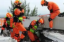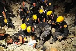 Rescue efforts began in the immediate aftermath of the earthquake, with able-bodied survivors extricating the living and the dead from the rubble of the many buildings that had collapsed.[157] Treatment of the injured was hampered by the lack of hospital and morgue facilities: the Argentine military field hospital, which had been serving MINUSTAH, was the only one available until 13 January.[158] Rescue work intensified only slightly with the arrival of doctors, police officers, military personnel and firefighters from various countries two days after the earthquake.[159]