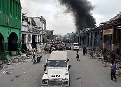Slow distribution of resources in the days after the earthquake resulted in sporadic violence, with looting reported.[99] There were also accounts of looters wounded or killed by vigilantes and neighbourhoods that had constructed their own roadblock barricades.[100][101] Dr Evan Lyon of Partners in Health, working at the General Hospital in Port-au-Prince, claimed that misinformation and overblown reports of violence had hampered the delivery of aid and medical services.[102][103]