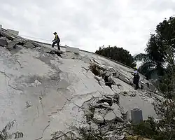 In February 2010, Prime Minister Jean-Max Bellerive estimated that 250,000 residences and 30,000 commercial buildings were severely damaged and needed to be demolished.[15] The deputy mayor of Léogâne reported that 90% of the town's buildings had been destroyed.[65] Many government and public buildings were damaged or destroyed including the Palace of Justice, the National Assembly, the Supreme Court and Port-au-Prince Cathedral.[66][67] The National Palace was severely damaged,[68][69] though President René Préval and his wife Elisabeth Delatour Préval escaped without injury.[70][71] The Prison Civile de Port-au-Prince was also destroyed, allowing around 4,000 inmates to escape.[72]