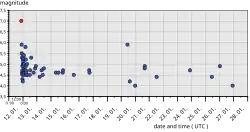 The U.S. Geological Survey recorded eight aftershocks in the two hours after the main earthquake, with magnitudes between 4.3 and 5.9.[44] Within the first nine hours, 32 aftershocks of magnitude 4.2 or greater were recorded, 12 of which measured magnitude 5.0 or greater; in addition, on 24 January, the US Geological Survey reported that there had been 52 aftershocks measuring 4.5 or greater since the main quake.[44]