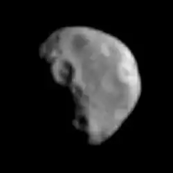 Ida's moon Dactyl was discovered by mission member Ann Harch in images returned from Galileo.[13] It was named after the Dactyls, creatures which inhabited Mount Ida in Greek mythology. Dactyl is only 1.4 kilometres (0.87 mi) in diameter, about 1/20 the size of Ida. Its orbit around Ida could not be determined with much accuracy, but the constraints of possible orbits allowed a rough determination of Ida's density and revealed that it is depleted of metallic minerals. Dactyl and Ida share many characteristics, suggesting a common origin.
