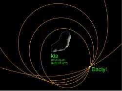 Ida has a moon named Dactyl, official designation (243) Ida I. It was discovered in images taken by the Galileo spacecraft during its flyby in 1993. These images provided the first direct confirmation of an asteroid moon.[37] At the time, it was separated from Ida by a distance of 90 kilometres (56 mi), moving in a prograde orbit. Dactyl is heavily cratered, like Ida, and consists of similar materials. Its origin is uncertain, but evidence from the flyby suggests that it originated as a fragment of the Koronis parent body.