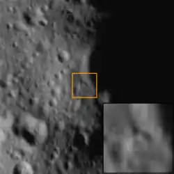 About 20 large (40–150 m across) ejecta blocks have been identified, embedded in Ida's regolith.[31][52] Ejecta blocks constitute the largest pieces of the regolith.[53] Because ejecta blocks are expected to break down quickly by impact events, those present on the surface must have been either formed recently or uncovered by an impact event.[47][54] Most of them are located within the craters Lascaux and Mammoth, but they may not have been produced there.[54] This area attracts debris due to Ida's irregular gravitational field.[47] Some blocks may have been ejected from the young crater Azzurra on the opposite side of the asteroid.[55]
