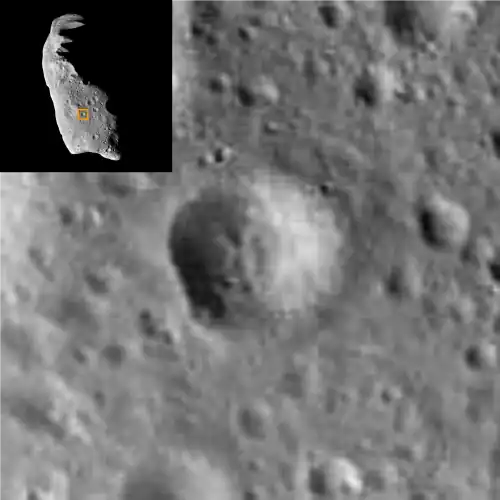 The two largest imaged craters on Dactyl were named Acmon /ˈækmən/ and Celmis /ˈsɛlmɪs/, after two of the mythological dactyls. Acmon is the largest crater in the above image, and Celmis is near the bottom of the image, mostly obscured in shadow. The craters are 300 and 200 meters in diameter, respectively.[83]