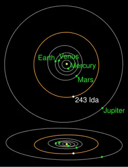 Ida is a member of the Koronis family of asteroid-belt asteroids.[18] Ida orbits the Sun at an average distance of 2.862 AU (428.1 Gm), between the orbits of Mars and Jupiter.[3][5] Ida takes 4.84089 years to complete one orbit.[5]