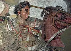 Alexander the Great is portrayed at the Battle of Gaugamela (331 BCE) on a mosaic found on the floor of the House of the Faun in Pompeii. He is astride his famous horse Bucephalos and wears a breastplate decorated with the head of Medusa.