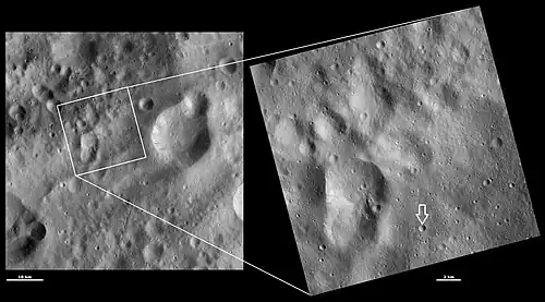 —Scully, J. E. C.; et al. (2014). "Sub-curvilinear gullies interpreted as evidence for transient water flow on Vesta" (PDF). 45th Lunar and Planetary Science Conference (1777): 1796. Bibcode:2014LPI....45.1796S. - ^ Schäfer, M.; Nathues, A.; Williams, D. A.; et al. (December 2014). "Imprint of the Rheasilvia impact on Vesta – Geologic mapping of quadrangles Gegania and Lucaria" (PDF). Icarus. 244: 60–73. Bibcode:2014Icar..244...60S. doi:10.1016/j.icarus.2014.06.026. hdl:2286/R.I.28060. Archived from the original (PDF) on 28 April 2019. Retrieved 24 September 2019.