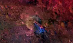 The Dawn mission's VIR instrument helped to confirm the basin's deep excavation and compositional diversity. VIR mapping revealed spectral variations across the basin consistent with the mixing of different crustal layers expected in the HED meteorites. Signatures matching eucrites (shallow crustal basalts) and diogenites (deeper crustal orthopyroxenites) were identified, which usually correlate with specific morphological features like crater walls or slump blocks.[81][27] The confirmed signature of olivine-rich material, which were first hinted at by Hubble observations is strongest on the flanks of the central peak and in specific patches along the basin rim and walls, suggesting it is not uniformly distributed but rather exposed in distinct outcrops.[82][81] As the dominant mineral expected in Vesta's mantle beneath the HED-like crust,[10] the presence of olivine indicates the Rheasilvia impact penetrated Vesta's entire crust (~20–40 km (12–25 mi) thick in the region) and excavated material from the upper mantle.[82] Furthermore, the global stresses resulting from this massive impact are considered the likely trigger for the formation of the large trough systems, like Divalia Fossa, that encircle Vesta's equatorial regions.[83][70]